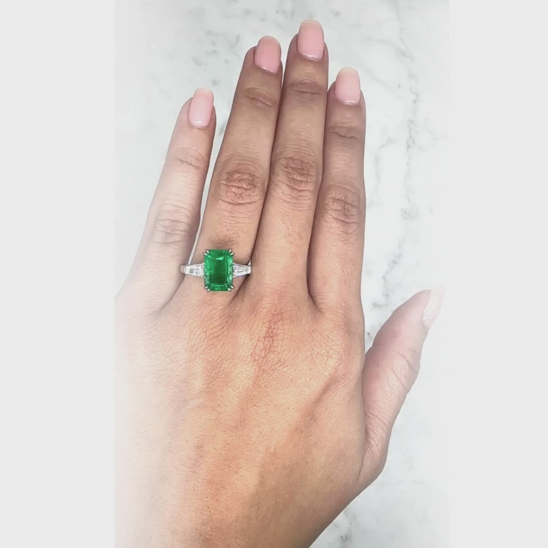 Classic in silhouette, rich in detail — this 3.36-carat Zambian emerald takes centre stage in a timeless three-stone design. The emerald’s vivid green hue is beautifully complemented by a pair of tapered step-cut diamonds (0.53 carats total), each one precisely angled to frame and elevate the center gem.