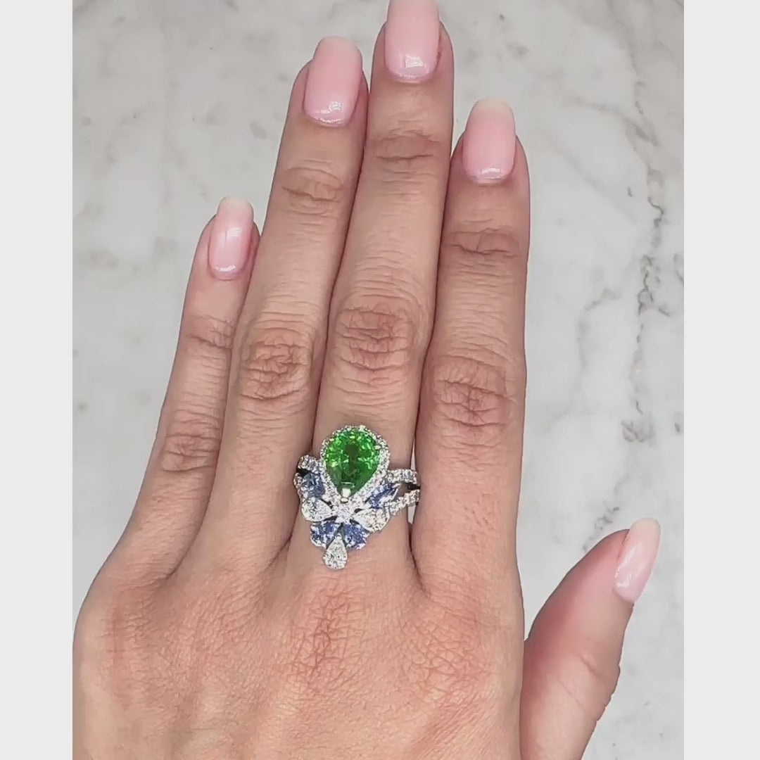 A striking composition of color, light, and precision, this 3.52-carat pear-cut tsavorite garnet takes center stage, framed by a vibrant contrast of deep blue sapphires and diamonds. With an intense green hue rivaling the finest emeralds, the tsavorite’s brilliance is amplified by its sapphire accents—an unexpected pairing that enhances both depth and vibrancy.
