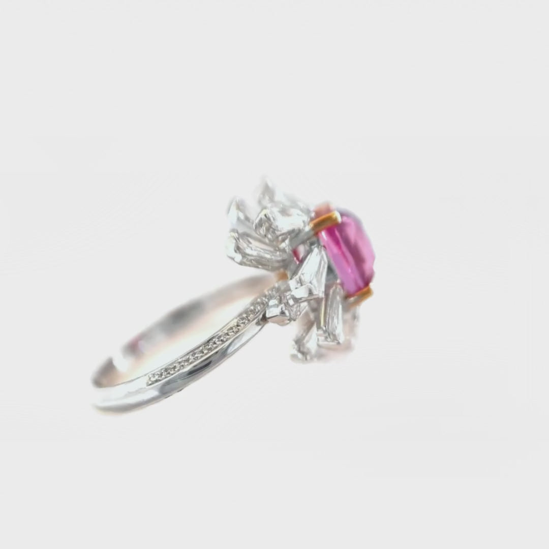 This Pink Spinel and Diamond Ring showcases an extraordinary composition of color, light, and form. At its center, a 2.58-carat pink spinel, certified for its authenticity, displays a striking balance of brilliance and depth—an embodiment of the stone’s growing prestige in high jewelry. The design is elevated by 16 uniquely cut kite-shaped diamonds (1.78 carats total), their geometric form enhancing the ring’s architectural elegance. Additional melee diamonds provide a refined embellishment, set in 18K gold to maximize brilliance and contrast.