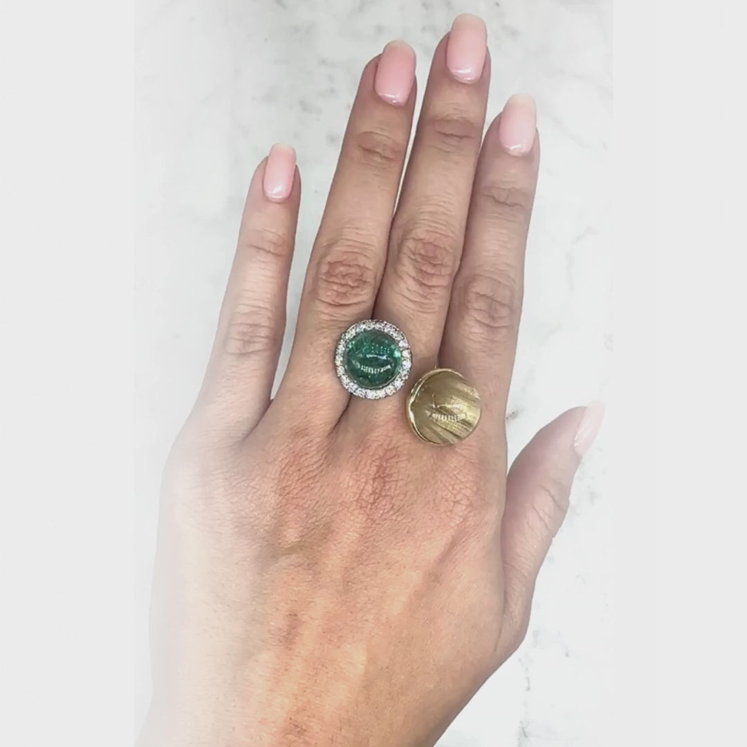 This striking double-stone ring features a bold combination of a 9.07-carat green tourmaline cabochon and a 17.29-carat rutilated quartz cabochon, set in contrasting 18K black and yellow gold. The rich green tourmaline is encircled by a delicate halo of diamonds, enhancing its natural depth. The rutilated quartz, with its golden needle-like inclusions, creates a captivating, almost celestial effect — each rutile strand suspended within the quartz is entirely natural, making every stone a one-of-a-kind treasure.